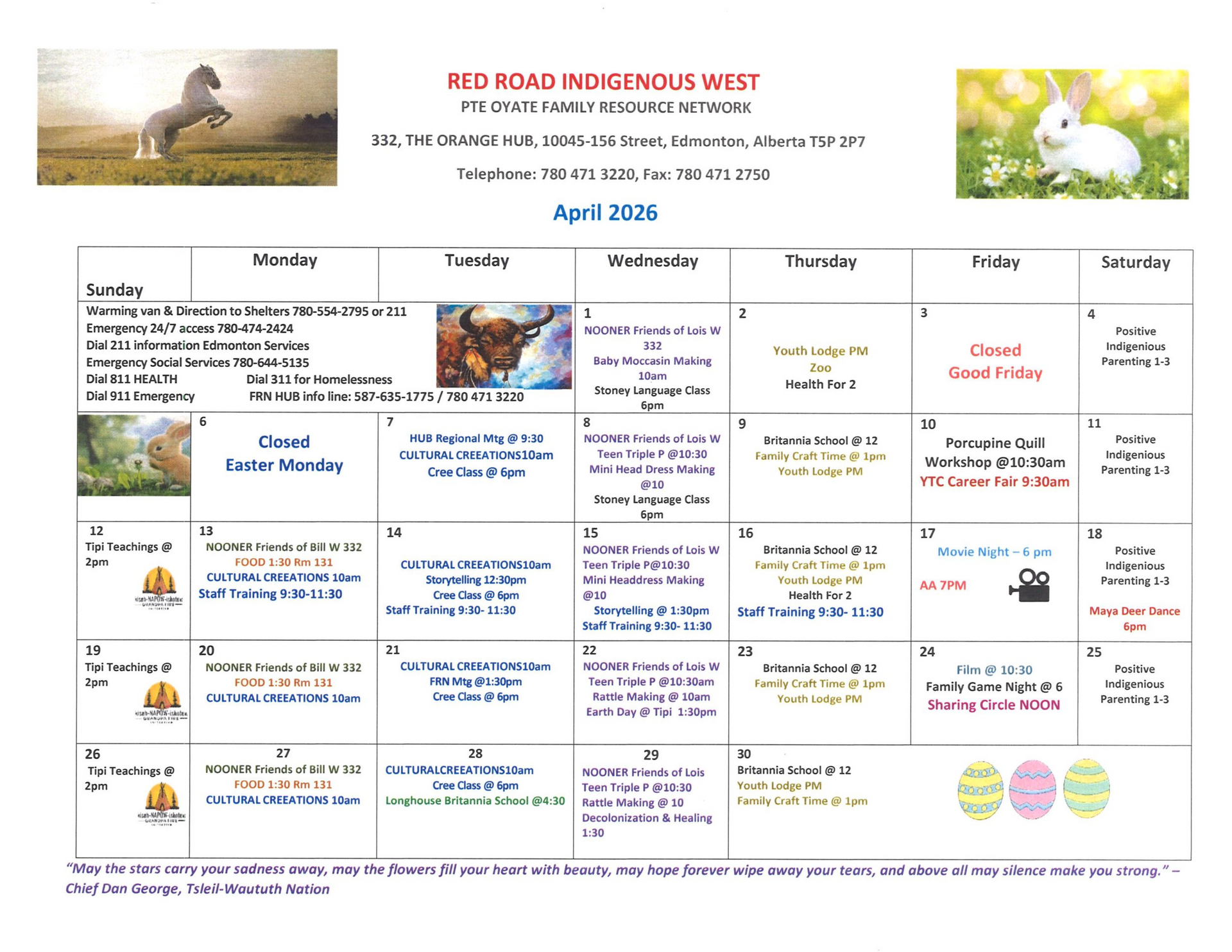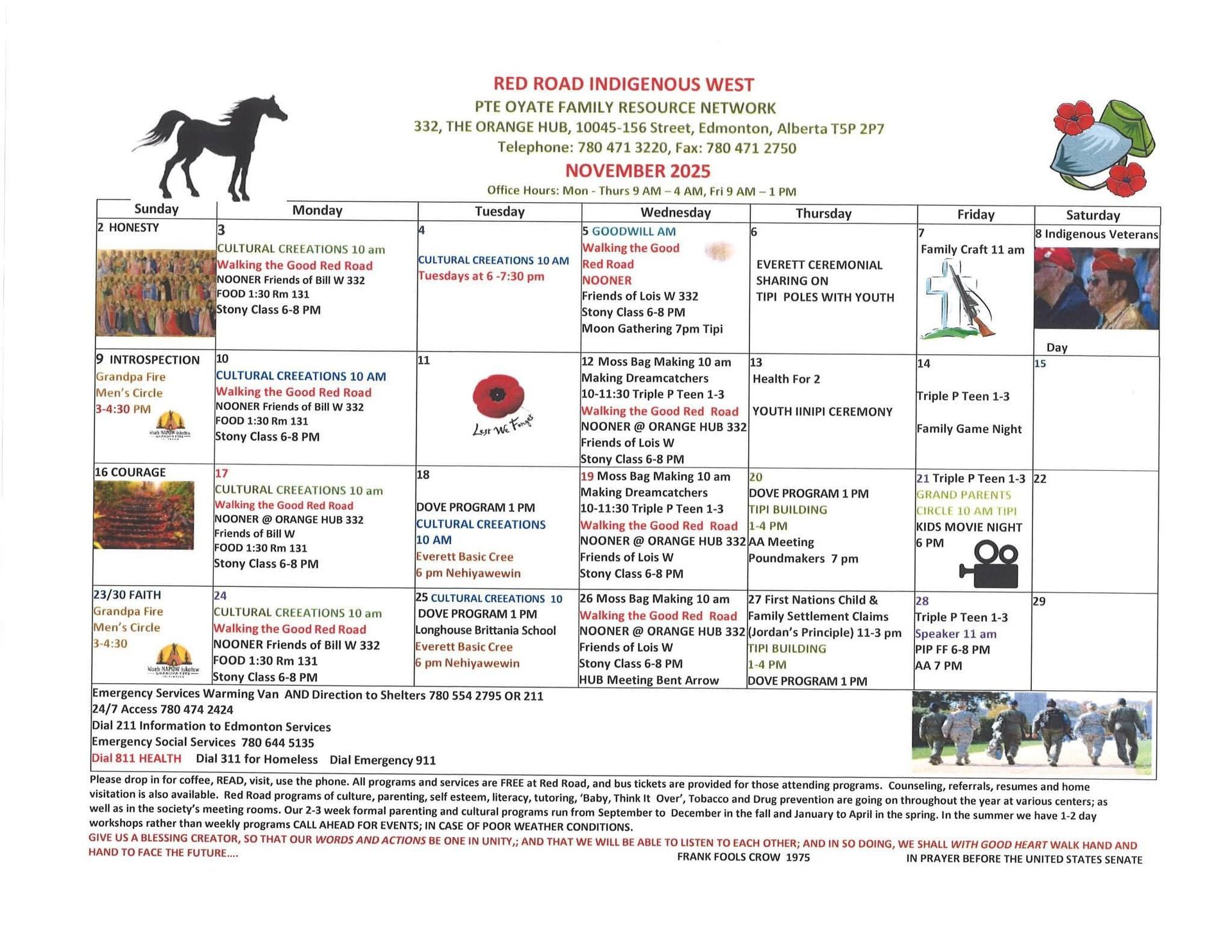 The Red Road Healing Society is a not for profit Child and Family Resource Center that is accessible, friendly, safe, warm, welcoming and free. Holistic wellness programming for children, youth and families is provided that utilizes a variety of Indigenous cultural perspectives, knowledge and practices. Outreach to the community occurs regularly through home visits, school liaison and special events.