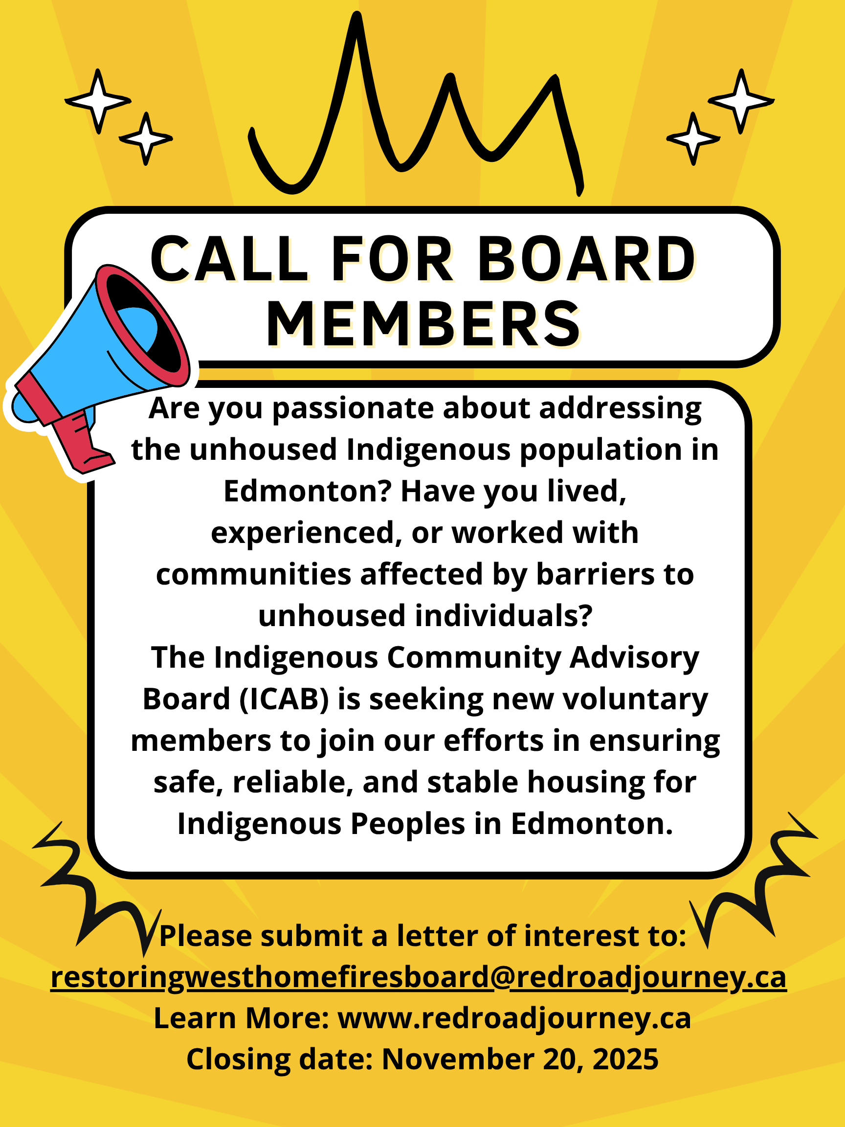 The Indigenous Community Advisory Board (ICAB) community members include those with lived experience, frontline housing workers, and experts in the homelessness sector. The ICAB guides funding decisions to ensure eligible projects reflect the voices of the Indigenous community and sets priorities for addressing Indigenous houselessness in the community of Edmonton.